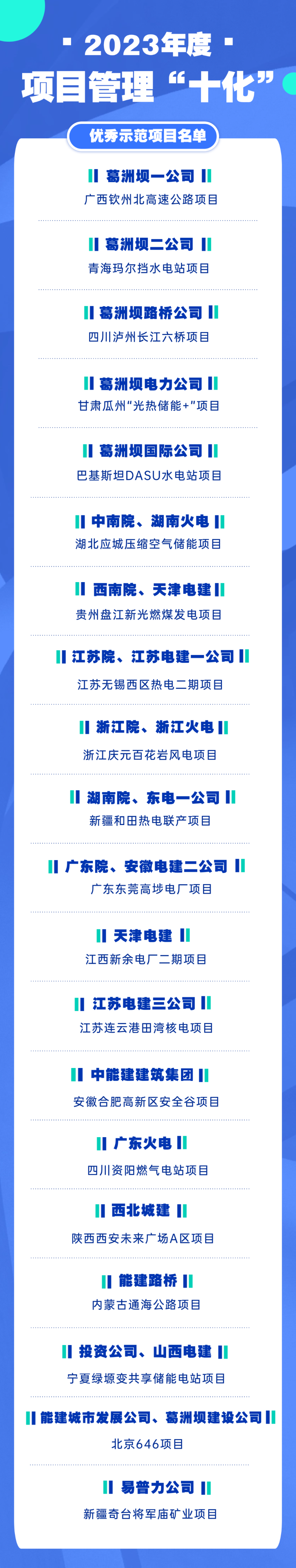 工程项目是企业发展的命脉,是价值创造的源泉,是品牌提升的“硬公关”。2023 年,中国能建以“项目履约提升年”专项行动为契机,全级次狠抓项目管理“十化”落地,深入开展优秀示范项目的创建工作,持续推动项目管理向科学化、数字化转变。为表彰先进、树立典型,经所属企业推荐、公司组织评选,决定授予20个项目“2023年度项目管理‘十化’优秀示范项目”荣誉称号。